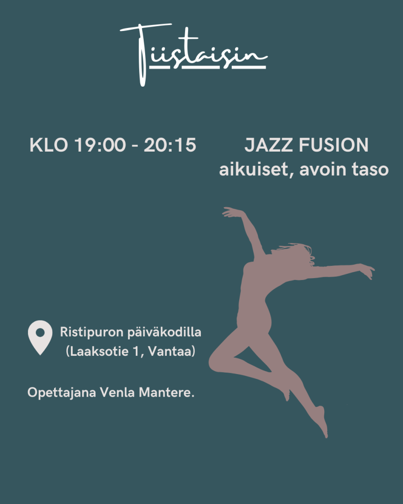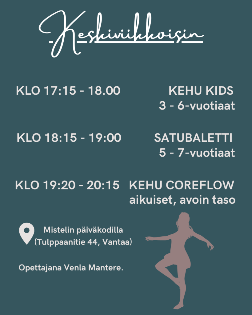 Syyskaudella 2025 viikkotunteja on Ruskeasannan alueella, Ristipuron ja Mistelin päiväkodeissa. Valikoimasta löytyy tanssitunteja aikuisille ja lapsille sekä kehonhuoltotunti ja joogaa aikuisille. (Aikuisten tunneille voivat pääsääntöisesti osallistua myös 15 vuotta täyttäneet nuoret.)