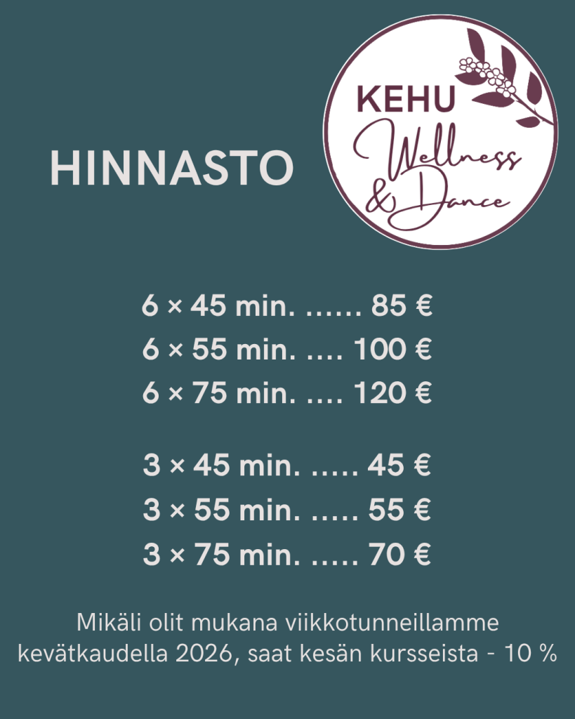 Kesäkaudella 2026 viikkotunteja on Ruskeasannan ja Ilolan alueella. Ristipuron päiväkodilla, Mistelin päiväkodeilla ja Ilolan koululla.. Valikoimasta löytyy tanssitunteja aikuisille ja lapsille sekä kehonhuoltotunti ja joogaa aikuisille. (Aikuisten tunneille voivat pääsääntöisesti osallistua myös 15 vuotta täyttäneet nuoret.)